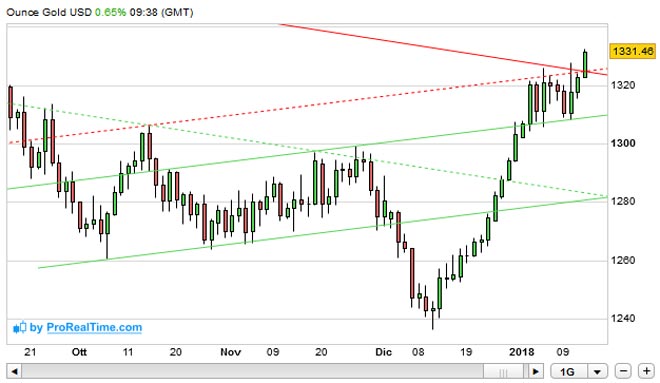 Se i prezzi dell'oro dovessero superare il livello di resistenza a 1.334 dollari, l'obiettivo sarà quello di raggiungere e testare i 1.348 dollari e se il trend continua, il prossimo livello importante è a 1.354 dollari l'oncia.