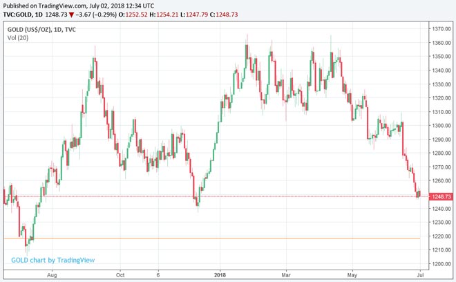 Prosegue al ribasso il prezzo dell'oro in questo inizio di luglio. Il metallo prezioso dopo essere scivolato sotto quota 1.300 dollari per oncia, ha raggiunto nelle ultime ore quota 1.250 dollari, valori più bassi del 2018.