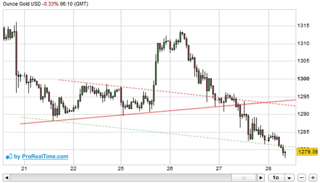 Se il metallo prezioso dovesse continuare a scendere rompendo il livello di supporto a 1.277 dollari, cercherà di raggiungere il prossimo supporto a 1.270 e in caso di ulteriore rottura, il trend al ribasso continuerà verso 1.260 dollari l'oncia.