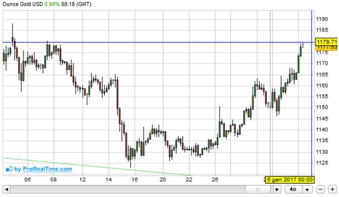 Durante le ore di trading di ieri, l'Oro ha aumentato il suo valore da 1.158,26 a 1.163,12 dollari l'oncia. Questa mattina il metallo prezioso si trova a quota 1.177 dollari, in prossimità di un livello di resistenza importante.