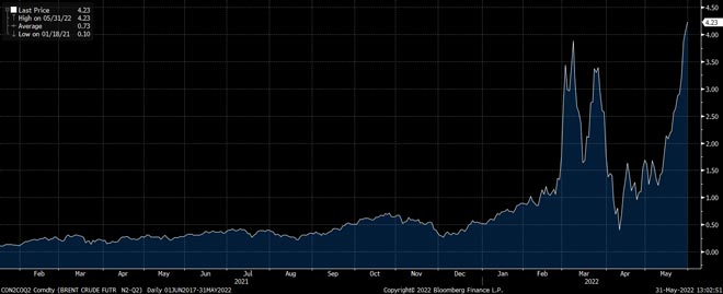 Il backwardation (prezzi spot superiori al prezzo forward) sul mercato del Brent ha superato i 4 dollari al barile per il contratto del mese in corso e del prossimo mese. Situazioni così estreme in passato sono state di breve durata, il che suggerisce che il petrolio potrebbe essere ipercomprato attualmente. Fonte: Bloomberg