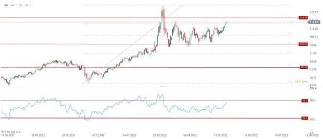 Tale forte arretramento indica una domanda a breve termine molto elevata sul mercato petrolifero. Ecco perché non si può escludere la continuazione dei guadagni nel breve termine. La zona di resistenza più vicina sul mercato del Brent si trova nell'area $ 123-125 e questo è un luogo in cui potrebbe verificarsi una reazione dal lato dell'offerta. È probabile che i prezzi scendano in un orizzonte di mesi, ma potrebbero rimanere nell'intervallo $ 100-110. Fonte: xStation5