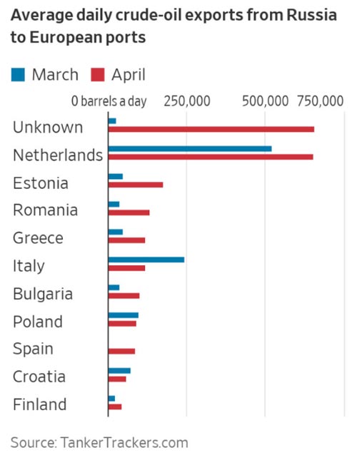 Va inoltre notato che l'embargo può essere solo parzialmente efficace. Dando un'occhiata ai dati di tracciamento delle petroliere, possiamo vedere che le esportazioni russe verso “destinazioni sconosciute” sono salite alle stelle ad aprile rispetto a marzo. Questo potrebbe aumentare ulteriormente con il nuovo embargo poiché alcuni paesi potrebbero tentare di aggirarlo.