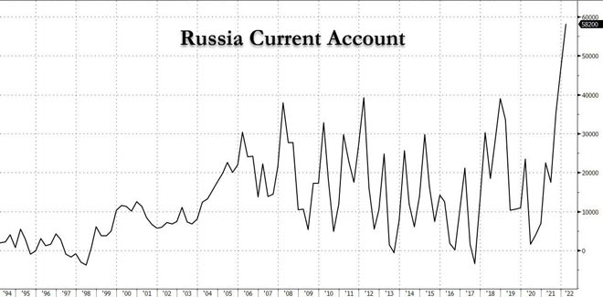 La Russia invia quantità record di greggio in India e Cina. Anche i ricavi sono record, anche se il greggio venduto in Asia viene spesso venduto con uno sconto di $ 30 al barile. Naturalmente, questi dati includono anche le esportazioni verso l'UE poiché non sono state ancora bloccate. L'avanzo delle partite correnti della Russia nel primo trimestre del 2022 ha raggiunto i 58,2 miliardi di dollari! Fonte: Bloomberg, Zerohedge