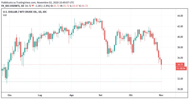 Se da un lato l'incertezza dell'esito delle elezioni presidenziali sta alimentato una certa prudenza da parte degli investitori che stanno ritirando soldi del mercato azionario e delle materie prime per la paura di un’elezione con esito conteso, il danno per la domanda di petrolio causato dalle misure di restrizione in Francia, Spagna, Italia e nel Regno Unito (altri paesi europei potrebbero seguire il loro esempio) con un evidente riduzione dei consumi di benzina, influenzano fortemente il prezzo del greggio.