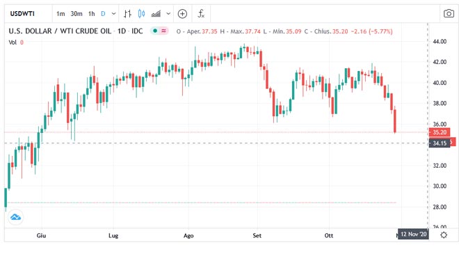 Prosegue il sell-off sul mercato del petrolio che, dopo la discesa di ieri, oggi le cose vanno ancora peggio. Nel momento della scrittura il prezzo del petrolio WTI segna un ribasso del 5,85% a 35,20 dollari per barile.