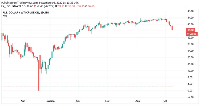 Quella di oggi è stata una delle peggiori giornate degli ultimi mesi per il petrolio che vede scendere il prezzo di oltre 6 punti percentuale raggiungendo un minimo intraday a 36,17 dollari.