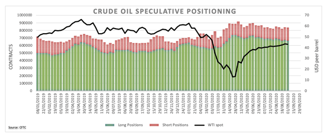 Secondo l'ultimo rapporto sul posizionamento della CFTC, Commodity Futures Trading Commission, le posizioni long del petrolio sono scese al livello più basso dall'inizio di aprile, il che fa pensare che la “comunità speculativa” sta scommettendo sulla discesa dei prezzi.