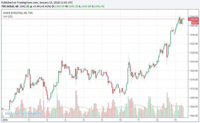 Continuano a salire le quotazioni dell'oro in questa nuova settimana raggiungendo il massimo degli ultimi 4 mesi superando quota 1.340 dollari l'oncia.