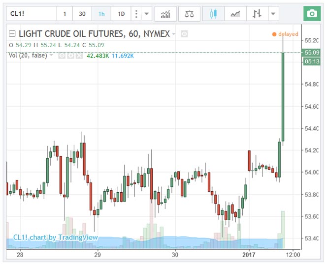 Le quotazioni del petrolio (Wti) questa mattina registrano un'impennata dei prezzi fin sopra ai 55 dollari al barile. Il rialzo dei prezzi è la conseguenza del taglio della produzione previsto a novembre dall'Opec e in vigore dal primo gennaio.
