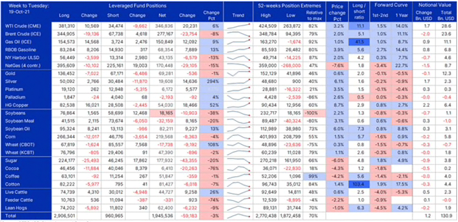 L’acquisto di rame è in fase di contrazione. Qui un’impennata dell’8,7% ha contribuito a guidare un aumento del 52% del net long, mentre il rally del 6,1% dell’argento ha contribuito a sostenere una triplicazione del net long a 14,6k lotti. A parte una riduzione del 15% nel famigerato contratto volatile del gas naturale, la reazione nel settore energetico è stata mista, con la domanda su gasolio e benzina in crescita, mentre la lunghezza netta combinata del petrolio greggio è stata ridotta per la seconda settimana. Questo perchè l’acquisto del WTI ha continuato ad essere compensato dalla vendita del Brent. Durante questo periodo il WTI long è aumentato di 31mila lotti mentre il Brent long è stato tagliato di 56mila lotti.