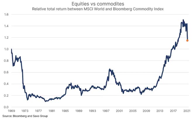 L'epica sovraperformance delle azioni rispetto alle materie prime dal 2009 al 2020 è stato un periodo storico in cui i maggiori motori di profitto del mondo si attivavano anche con scarsi input dal settore delle materie prime. La creazione di ricchezza in eccesso ha “affamato” il mondo per investimenti nel mondo fisico, preparando l'economia a un massiccio shock di vincolo dell'offerta.