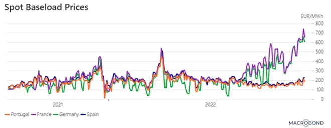 Sul versante spot, i prezzi dell'energia elettrica continuano a mantenersi vicini ai massimi storici in Francia e Germania, rispettivamente a 641 e 604€ per MWh. Al contrario, rimangono relativamente bassi in Spagna e Portogallo, circa 200€ per MWh. È circa 10 volte di più rispetto a prima del Covid, tuttavia.