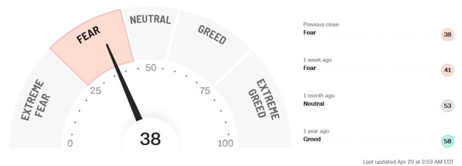 Il Vix ha fatto alcuni passi indietro. Da una salita di quasi 200 punti, in tempi normali, avremmo aspettato molto di più, una caduta sostanziale della volatilità: non è avvenuto e il Vix viaggia ancora, mentre scrivo, più vicino a 29 che a 28. Valori che non depongono per un clima sereno: leggera paura, una sorta di conferma dell'indice di CNN.