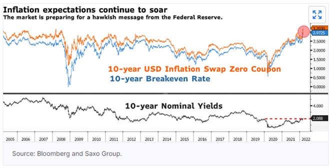 Oggi, il mercato si è convinto che la riunione della Federal Reserve sarà molto più aggressiva del solito, dal momento che le aspettative di inflazione continuano a salire. In aumento anche i rendimenti nominali, con quelli a 10 anni che superano il 2,10% per la prima volta da luglio 2019. Sembra che il mercato si stia preparando ad un'escalation dopo la riunione della BCE.