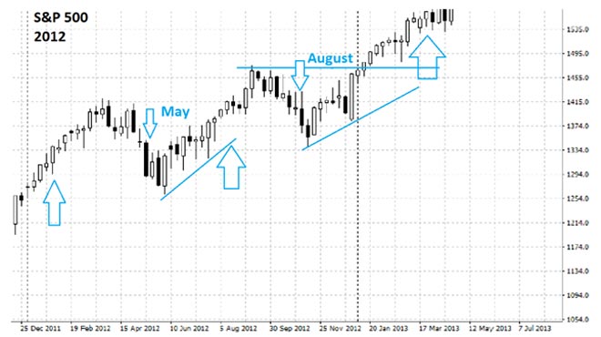 Il 2012 è stato forse il primo anno emblematico da poter controllare, poiché segna la completa ripresa dalla recessione del 2008-2009. Il Dow Jones Industrial Average era vicino a 13.000 punti all'epoca, e l'indice S&P 500 non era lontano dalla soglia dei 1.400 punti. Nel maggio dell'ormai lontano 2012, si è effettivamente verificata una delle due correzioni al ribasso di quell'anno. Tuttavia, entrambe le correzioni, a maggio e agosto, non sono state troppo forti. Erano evidenti solo sullo sfondo di “chart” piuttosto neutre per il 2012 (vedi img. 1). Ecco perché la correzione di maggio 2012 potrebbe rimanere impressa nella mente degli investitori.