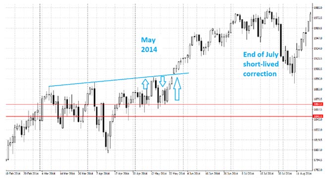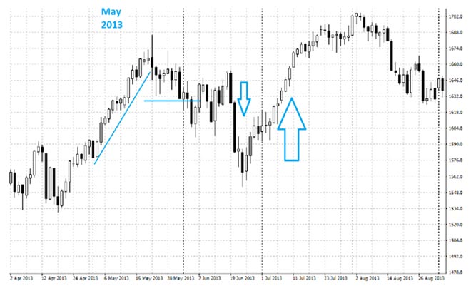 Nel 2013, come si può dedurre dal grafico seguente (img. 2), c'è stata una solida crescita del mercato azionario per la maggior parte del mese di maggio. Una volatilità moderata con fluttuazioni diversamente dirette si è verificata solo alla fine del mese, mentre una correzione più solida è intervenuta nella seconda metà di giugno. Tuttavia, a luglio, il mercato ha superato i massimi precedenti, motivo per cui i grafici non hanno confermato i trend ribassisti di maggio.