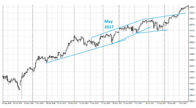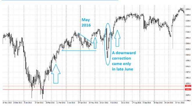 Maggio 2017 è stato ricordato per il calo dell'S & P 500 di circa 50 punti per un giorno e mezzo, e questo è stato l'unico dato al ribasso (vedi img. 6). Passo dopo passo, l'arrampicata è proseguita per molti mesi consecutivi in questo anno.