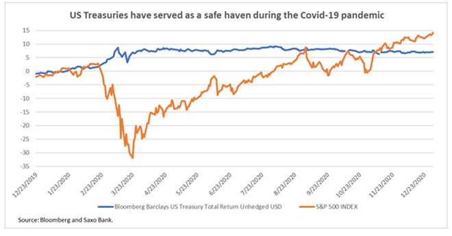 Ad esempio, nel periodo di febbraio e marzo 2020, gli investitori hanno liquidato le loro posizioni azionarie per acquistare Treasury USA e Bunds nel tentativo di trovare riparo mentre sul mercato regnava il caos. Questo comportamento ha aggravato i forti sell-off sul mercato azionario, e mentre i Treasury USA sono saliti fino al 9%, lo S&P è sceso di oltre il 30%. Quanto esposto è l'esempio perfetto per comprendere il motivo per cui le obbligazioni rappresentano una componente vitale di un portafoglio ben bilanciato, in quanto offrono opportunità di diversificazione e permettono di ridurre le perdite.