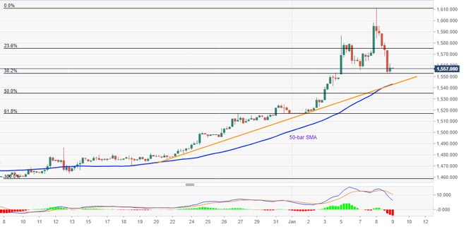Considerando il segnale ribassista del MACD a 12 bar, è probabile che i prezzi rimangano bassi nel breve periodo. In tal modo, una confluenza di SMA a 50 bar e una linea di tendenza inclinata verso l'alto i 1.542,80 / 1.543,30 possono essere il primo obiettivo dei venditori. Se però i prezzi dovessero continuare a scendere al di sotto di $ 1.542,80, i prossimi livelli di supporto si trovano a 1.525 dollari (massimo del 31 dicembre) e successivamente 1.516,80 dollari (livello di ritracciamento di Fibonacci del 61,8% al rialzo tra dicembre e gennaio).