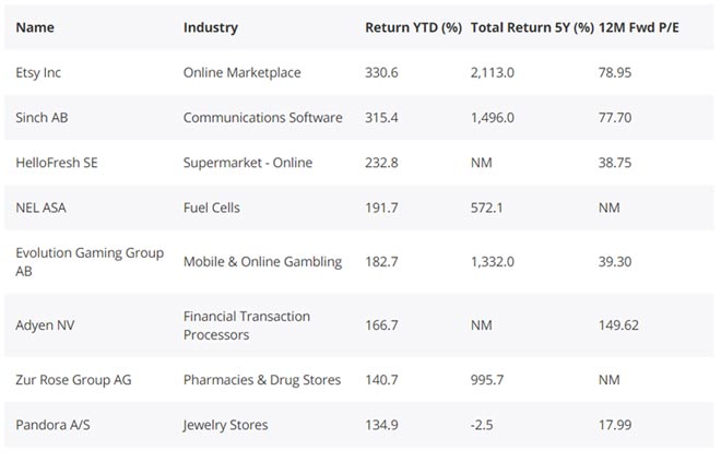 Se osserviamo i due maggiori mercati azionari del mondo, quello degli Stati Uniti e quello dell’Europa, c'è una chiara differenziazione tra i vincitori e gli sconfitti per quanto riguarda i singoli titoli. I 20 titoli che hanno registrato la migliore performance in questi due mercati hanno avuto un rendimento medio year-to-date di circa il 148% (in valuta locale), guidato da forti guadagni su titoli come Etsy, Sinch, Hellofresh, NEL e Adyen che fanno tutti parte del trend della trasformazione digitale e green di quest'anno. La pandemia ha favorito le aziende esposte alla digitalizzazione e i governi hanno aumentato i loro impegni di investimento sulla trasformazione green con un nuovo “green deal” all’interno dell’Unione Europea, favorendo le aziende esposte in questo settore.