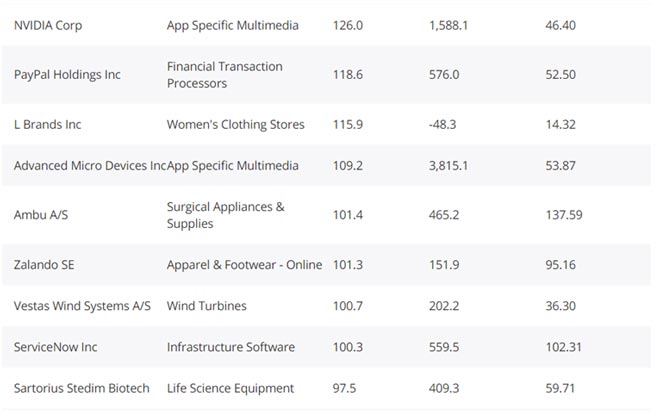 Una società che non è presente nella lista dei vincitori è Tesla, che è diventata quest'anno una delle aziende più preziose al mondo poiché la domanda di veicoli elettrici è cresciuta drasticamente e, nonostante le ricadute economiche, questa ne ha alimentato l'espansione e sancito il dominio nel futuro settore automobilistico oltre che averle attribuito un ruolo importante nel futuro dei mercati energetici. Tesla è stata recentemente inserita all’interno dell'indice S&P 500, e sarebbe sicuramente all’interno della lista seguente se ne avesse già fatto parte nel corso dell’anno.