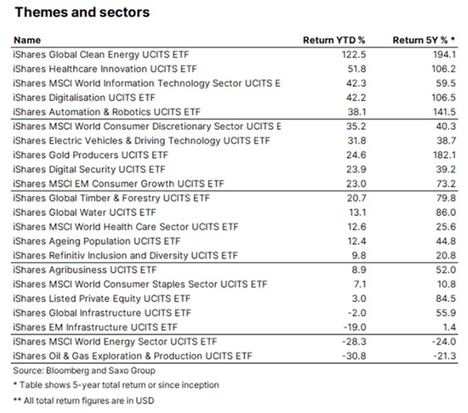 Quest'anno sarà ricordato per lo spettacolare rimbalzo dei titoli legati al mondo online e alla trasformazione green, e per i loro rendimenti. Come mostra la tabella seguente, i grandi vincitori sono stati i titoli esposti al settore dell’energia pulita, in rialzo del 123% year-to-date, in quanto gli investitori scommettono che la nuova amministrazione di Biden negli Stati Uniti cambierà enormemente il panorama delle azioni di società facenti parte del settore dell’energia pulita negli Stati Uniti. La Cina si è recentemente impegnata a diventare carbon neutral entro il 2060 ed è quindi previsto che riallocherà i propri investimenti nei prossimi 10 anni. In Europa, che era già in testa al gioco, il recente “green deal” non farà altro che accelerare questa tendenza. Come abbiamo scritto all'inizio di gennaio, la trasformazione green sarà probabilmente una delle più grandi tendenze nei mercati finanziari nel corso del prossimo decennio e alcune delle aziende più preziose al mondo, in futuro, saranno quelle che aiuteranno a risolvere i problemi legati alla sostenibilità ambientale e al cambiamento climatico.