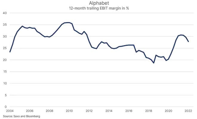 La società ha ingaggiato 10.000 nuovi dipendenti nel terzo trimestre, un aumento aggressivo dato il rallentamento dell'economia, ma ora afferma che le assunzioni saranno notevolmente inferiori in futuro. Il margine EBIT di Alphabet è diminuito nei 10 anni precedenti la pandemia che ha poi alzato i prezzi a causa dell'elevata crescita dell'economia online. Già lo scorso anno la storia è cambiata con il margine operativo in forte discesa dal 32,3% al 24,8% nel terzo trimestre quest’anno.