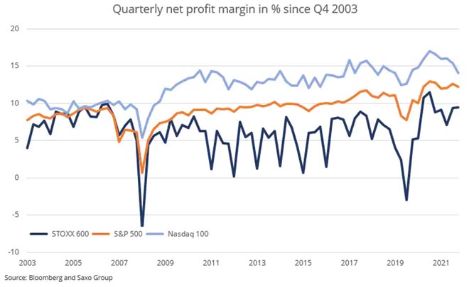 Microsoft ha fornito il miglior indizio di questo andamento, annunciando che si aspetta 800 milioni di dollari in più di costi energetici nell'anno fiscale in corso, che è circa l'1% del suo attuale reddito operativo. Più in generale, come mostra il grafico del margine di profitto netto di seguito, le società tecnologiche statunitensi stanno affrontando la più grande compressione dei margini dalla Grande Crisi Finanziaria.