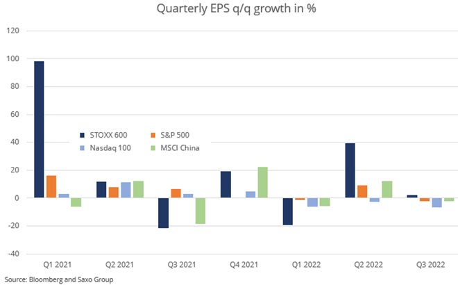 Siamo ancora all'inizio degli utili del terzo trimestre, ma le indicazioni iniziali suggeriscono che gli utili europei stanno andando meglio di quelli statunitensi e cinesi, anche a causa del dollaro USA forte che ovviamente crea terreno favorevole. Considerata questa dinamica degli utili relativamente migliore, le valutazioni azionarie più basse e un maggiore tasso di sconto, è opportuno avere un atteggiamento più positivo nei confronti delle azioni europee piuttosto che su quelle statunitensi.
