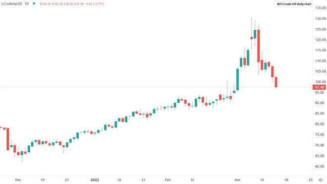 I prezzi del greggio WTI continuano a scendere dai massimi raggiunti durante la settimana precedente, poiché la speranza che i colloqui tra Russia e Ucraina possano portare a un'attenuazione del conflitto, mentre un aumento del numero di casi di Covid in Cina sta costringendo a nuovi blocchi nel paese.