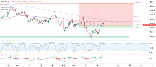L'indice DAX-40 è ancora scambiato al di sopra del suo primo supporto immediato a 13.900,0 punti nonostante il leggero ritracciamento di oggi. Un rimbalzo oltre quel livello potrebbe portare rapidamente i prezzi verso l'ultimo massimo di circa 14.080,0 punti.