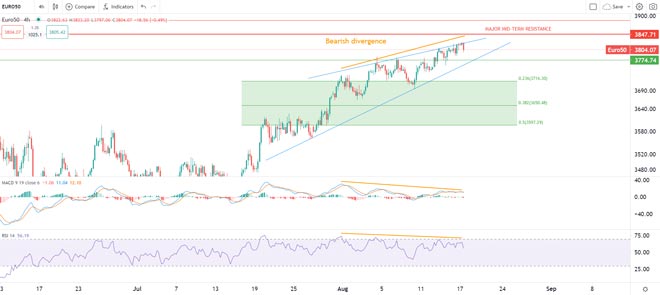 Nel frattempo, la maggior parte dei benchmark dell'UE sta rallentando la propria tendenza rialzista poiché i prezzi si avvicinano alle principali resistenze a medio termine. L'indice Stoxx-50 è ora scambiato all'interno di un minaccioso cuneo ascendente, generalmente visto come un pattern grafico di inversione, con alti e bassi sempre meno potenti, mentre divergenze ribassiste sono già state registrate sia dall'RSI che dal MACD.