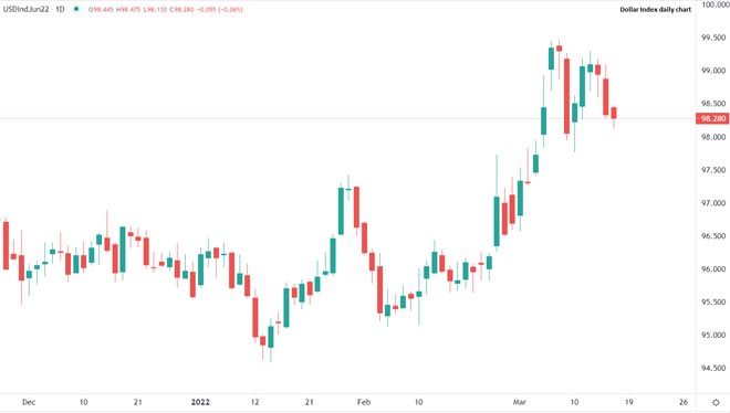 L'indice del dollaro USA ha registrato un movimento al ribasso dopo l'annuncio del primo aumento dei tassi di interesse dal 2018 da parte della Federal Reserve nella serata di ieri.