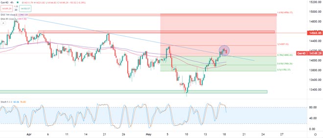 L'indice DAX-40 registra una delle peggiori performance oggi, con il mercato che viene scambiato al di sotto di 14.150 punti, una mossa correttiva a seguito della recente compensazione della sua linea di tendenza ribassista di medio termine.