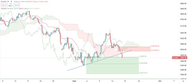 L'indice Stoxx-50 ha ora rotto la sua linea di tendenza rialzista a breve termine che ha sostenuto i prezzi dall'inizio del mese e ora si sta dirigendo verso nuovi minimi mensili. I prezzi vengono scambiati vicino al loro primo supporto (espansione di Fibonacci del 50%) a 3.485 punti con la zona di 3.440 punti in vista.