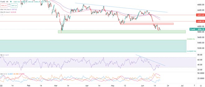 Parlando di Treasury, i bond francesi sono scivolati al ribasso in seguito ai risultati deludenti delle elezioni per il presidente Macron che non è riuscito a ottenere la maggioranza al Parlamento, un risultato che minaccerà in modo significativo i suoi piani di riforma per il Paese. L'indice CAC-40 viene scambiato vicino al suo minimo annuale, leggermente al di sotto del segno di 5.900,0 punti finora. La mancanza di una forte reazione rialzista sulla zona di supporto 5.750/5.850 potrebbe portare rapidamente a un'estensione delle vendite verso 5.500,0 e 5.050,0 punti.