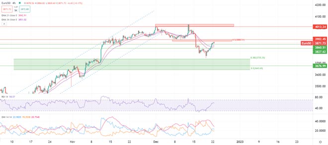 L'indice STOXX-50 ha ora superato la sua prima resistenza a breve termine a 3.860 punti, che funge ora da zona di supporto per il mercato, con i prezzi continuano la loro salita verso la resistenza successiva a 3.888 punti / 3.900 punti. Questa zona è importante da un punto di vista tecnico (sovrapposizione dell'ultimo minimo di mercato + ritracciamento del 50%) e il mercato avrà probabilmente bisogno di un dato positivo per alimentare ancora la spirale rialzista dell'azionario degli ultimi giorni.