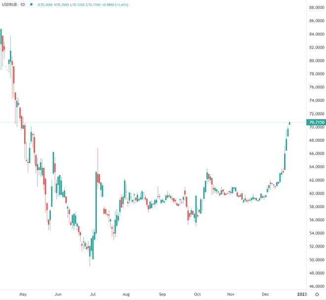 Da segnalare anche il rublo, con la valuta russa che scende rispetto al dollaro e si avvicina a un livello che non si vedeva da aprile. Questa discesa è causata probabilmente dall'impatto delle nuove sanzioni sulle esportazioni russe di petrolio e gas, con la valuta che ora si avvicina all'importante livello di supporto di 70 rispetto al dollaro, il cui cedimento potrebbe creare spazio per ulteriori perdite.