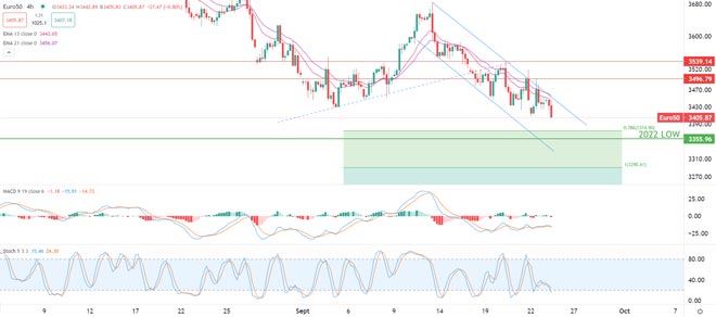 L'indice Stoxx-50 sta ancora flirtando con il suo minimo di 2 mesi intorno a 3.400 punti, scambiato all'interno di un canale ribassista a breve termine. Il prossimo supporto può essere posizionato verso 3.375 punti e 3.355 punti, il livello più basso raggiunto quest'anno. Rompere questo livello sarebbe estremamente minaccioso per i prezzi in quanto aprirebbe le porte a una correzione più profonda verso 3.300, 3.050 punti e 2.730,0 punti per estensione.