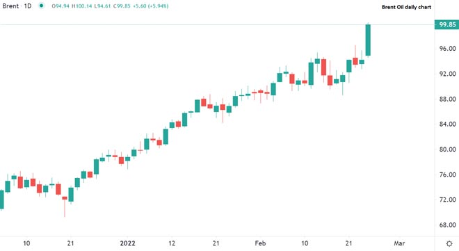 Giovedì, i prezzi del petrolio greggio Brent hanno sorpassato i 100 dollari al barile per la prima volta dal 2014, aumentando il 5% dal momento in cui si è diffusa la notizia dell'invasione russa in Ucraina. L'intenzione di Mosca di lanciare un attacco militare era stata denunciata nelle ultime settimane da diversi governi occidentali, generando una narrativa che, in mezzo ad una più generale carenza di forniture di petrolio, ha contribuito a sostenere il rally dei prezzi cominciato alla fine dello scorso anno. A conferma dello scenario più temuto, l'assalto militare completo porterà' sanzioni occidentali che condurranno la Russia a non essere in grado o a non essere disposta a vendere le sue materie prime all'Europa e ad altri paesi occidentali, rendendo la carenza di forniture di petrolio ancora più evidente e risultando in prezzi ancora più alti.