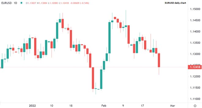 L'esposizione della moneta unica a questa crisi deriva dal potenziale impatto economico degli eventi in corso nell'Europa orientale, che probabilmente aggraveranno la già presente crisi energetica, alimentando la pressione inflazionistica e ostacolando le prospettive di ripresa dell'Eurozona. A giocare contro la moneta unica c'è anche l'aumento dei flussi verso le valute rifugio, come lo yen giapponese, il franco svizzero e il dollaro, che si denota ogni volta che l'incertezza sui mercati finanziari cresce. Potrebbero così cominciare alcuni tempi duri per la moneta unica, con la possibilità che scenda al di sotto della soglia di 1,12 sul dollaro.