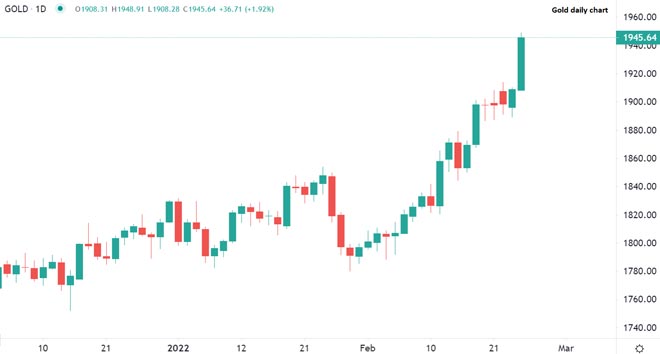 I prezzi dell'oro sono aumentati di oltre il 2% dopo che la Russia ha lanciato un'operazione militare su larga scala in Ucraina giovedì mattina.