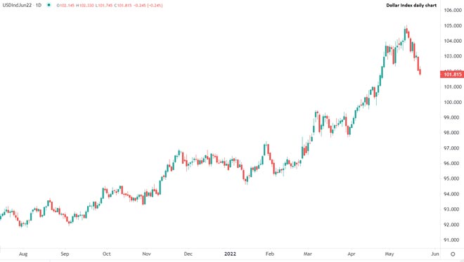 Il dollaro sta perdendo terreno rispetto ai suoi omologhi dal picco raggiunto a metà maggio, accompagnato da un calo dei rendimenti del tesoro, poiché i mercati si riadattano a uno scenario in cui la svolta della Federal Reserve verso un inasprimento delle politiche monetarie sembra essere scontata. Allo stesso tempo, la notizia che il lockdown della Cina potrebbe essere in procinto di allentarsi, consentendo la riapertura dei suoi principali hub di esportazione, così come le osservazioni del presidente Biden che suggeriscono un possibile allentamento dei dazi sulle importazioni cinesi, hanno stimolato un certo ottimismo tra gli investitori, mentre le prospettive migliori per l'economia globale erodono parte dell'attrattiva del dollaro.