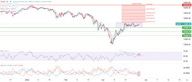 I titoli del Tesoro sono scivolati, insieme allo yen giapponese e all'oro, poiché la rotazione verso asset più rischiose continua, almeno a brevissimo termine. Tuttavia, in un quadro più ampio, la maggior parte degli indici azionari è ancora scambiata lateralmente all'interno di un range di negoziazione ristretto da metà marzo poiché permangono preoccupazioni relative sia alla guerra in Ucraina che alla prospettiva di politiche monetarie più restrittive.