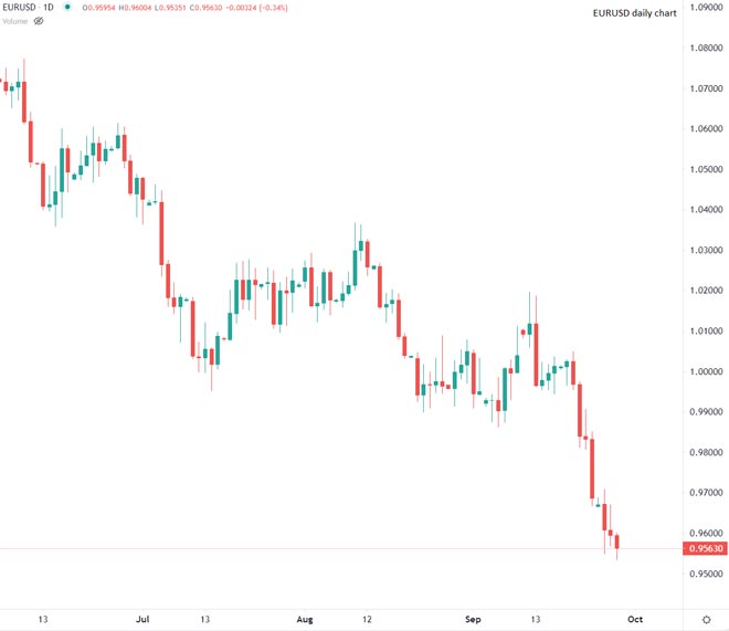 La debolezza della moneta unica rispetto al biglietto verde è guidata da due narrazioni parallele: Da un lato il dollaro inarrestabile, sostenuto dall'atteggiamento aggressivo della Federal Reserve e dall'appeal rifugio della valuta, ha aumentato il suo dominio sui mercati valutari negli ultimi mesi. D'altra parte, la situazione in Europa non è di aiuto per la moneta unica.