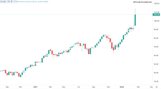 Il petrolio greggio WTI sembra destinato a chiudere la settimana con forti guadagni, avendo fino ad ora balzato del 15% dalla chiusura del mercato di venerdì scorso.