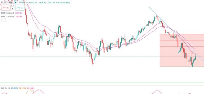 Madrid sta portando la migliore performance dell'UE fino a quando i prezzi flirtano con la forte zona di 7.900 punti/7.930 punti nel tentativo di cancellare la loro linea di tendenza ribassista. Tuttavia, mentre l'indicatore DMI mostra una crescente pressione rialzista a brevissimo termine, evidenzia anche una diminuzione della direzionalità del mercato, il che significa che l'attuale azione rialzista sui prezzi potrebbe finire presto.