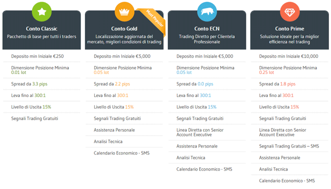 Conto Prime: Questo conto richiede un deposito di 10.000 euro e una dimensione minima di trading di 0,25 lotti. Gli spread offerti di negoziazione partono da 1,8 lotti mentre la leva finanziaria si differenzia dal tipo di trader, per i trader a dettagli la leva massima è di 1:30 per i professionisti è di 1:300.