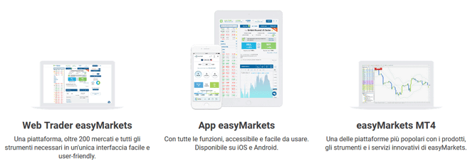 Per quanto riguarda le piattaforme, EasyMarkets ha scelto di soddisfare tutte le esigenze dei clienti offrendo ben tre piattaforme di trading: La WebTrader, la popolare MetaTrader 4 e la piattaforma mobile (app).